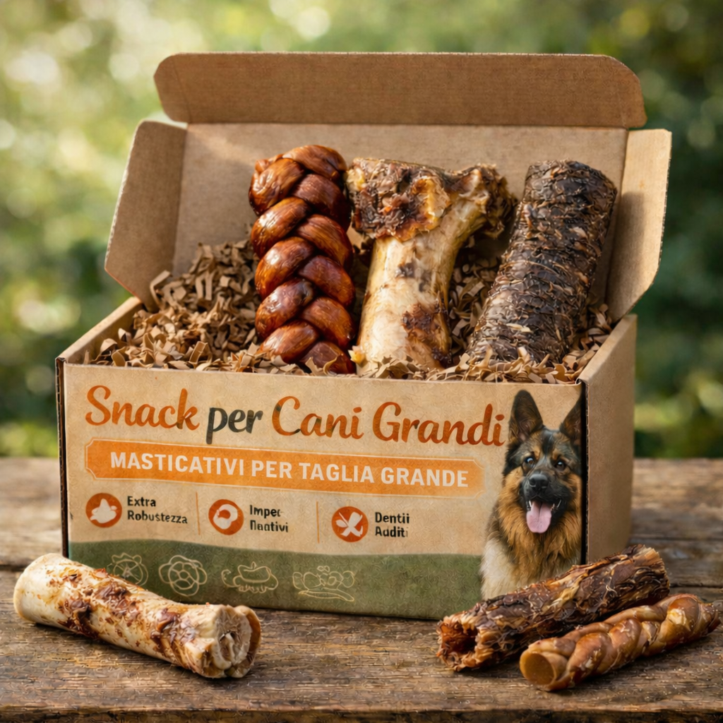 Pensata per i masticatori esperti, questa box contiene una selezione di masticativi resistenti e nutrienti, studiati per soddisfare le esigenze specifiche dei cani di taglia media e grande. Ogni prodotto è scelto per offrire durata, gusto e benefici funzionali reali.