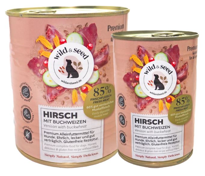 85% carne di cervo (60% carne muscolare, 21% polmoni, 4% colli), 5% zucchine, 4% grano saraceno, 3% semi di lino, 1% mirtilli rossi, 1% minerali